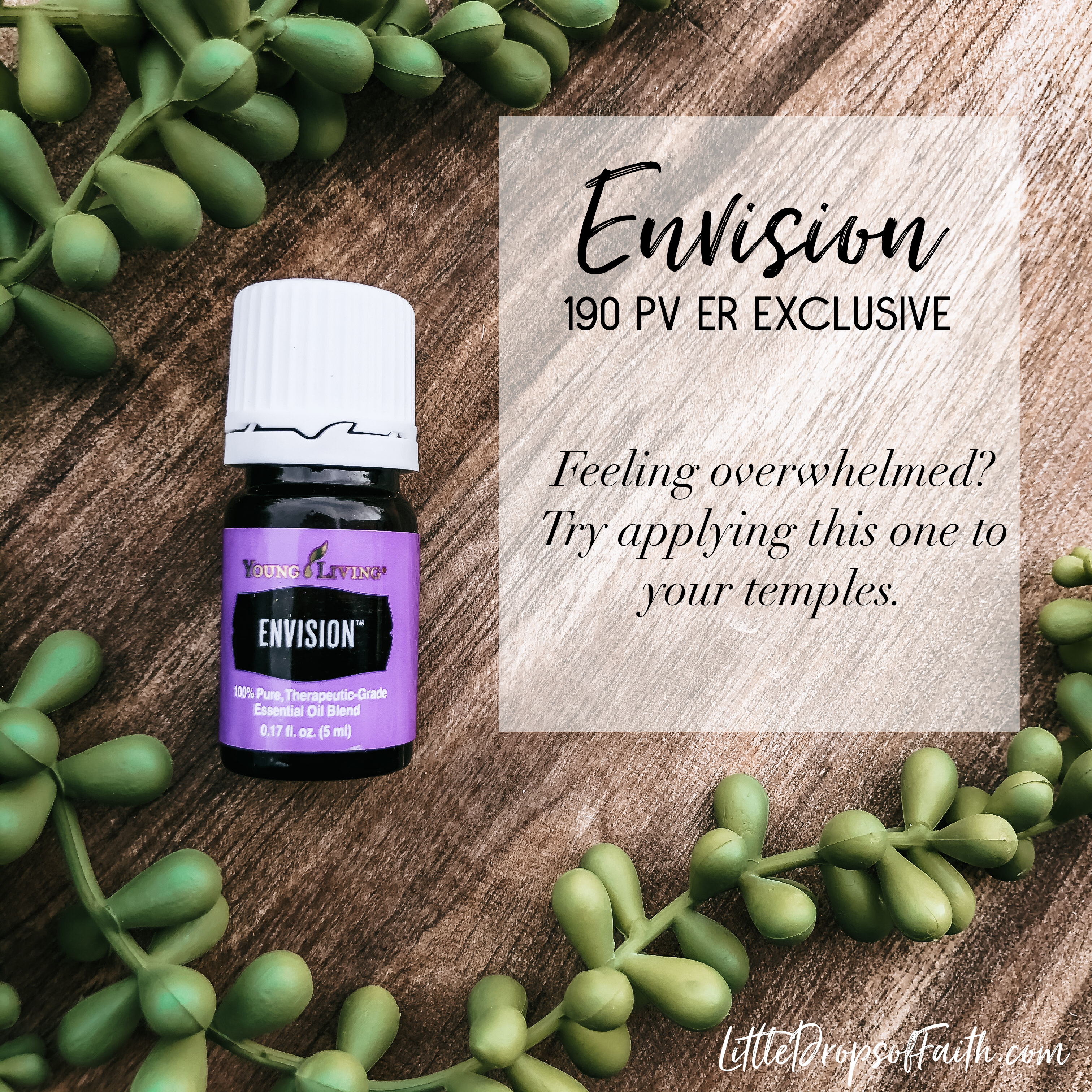 Envision free 5ml of Envision with 190pv order via Subscribe to Save previously known as ER. Picture is purple bottle of Envision on a wooden board surround by green succulent